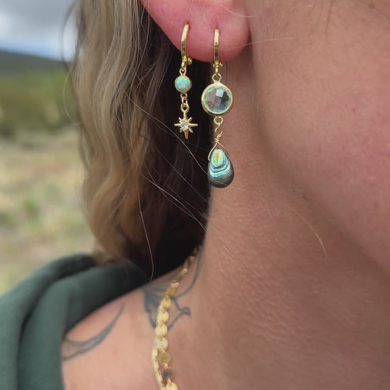 Sparkling blue cubic zirconia stone featuring a beautifully iridescent Abalone drops.
