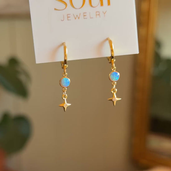 Huggie hoop earrings featuring beautiful flashy icy blue opals and tiny 4 point star charms with a cubic zirconia center stone