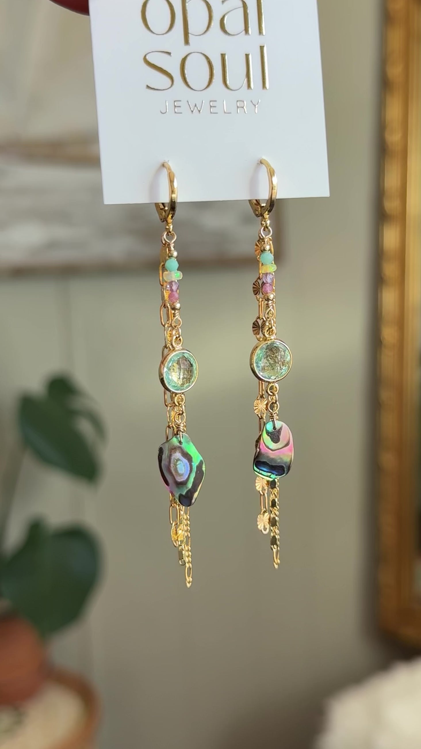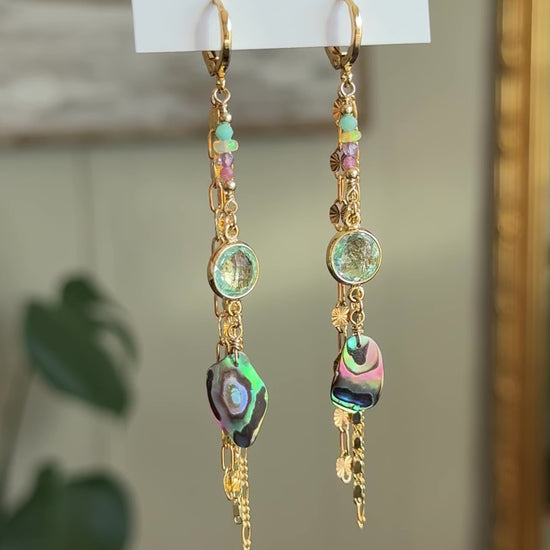 Intricately layered dangly earrings featuring tiny hand-beaded amazontie, opal, amethyst, and pink tourmaline stones, a sparkling center sky blue cubic zirconia stone, and beautifully iridescent abalone shell pieces