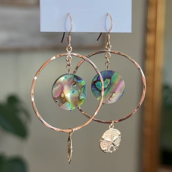 Gold-filled hammered hoops featuring beautifully iridescent abalone shell pieces and sand dollar charms
