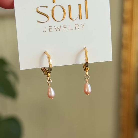 Gold-filled huggie hoops, featuring tiny elongated pink freshwater pearls- perfect for everyday wear or to elevate your earring stack