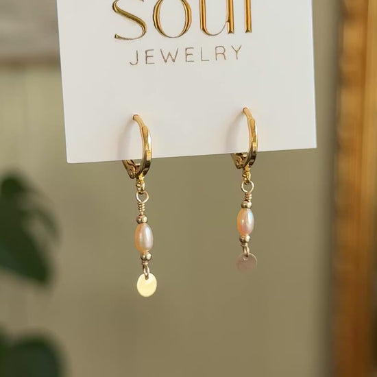Gold-filled huggie hoops featuring hand-beaded tiny champagne freshwater pearls, sacked with gold filled beads, and a tiny light catching gold-filled disc