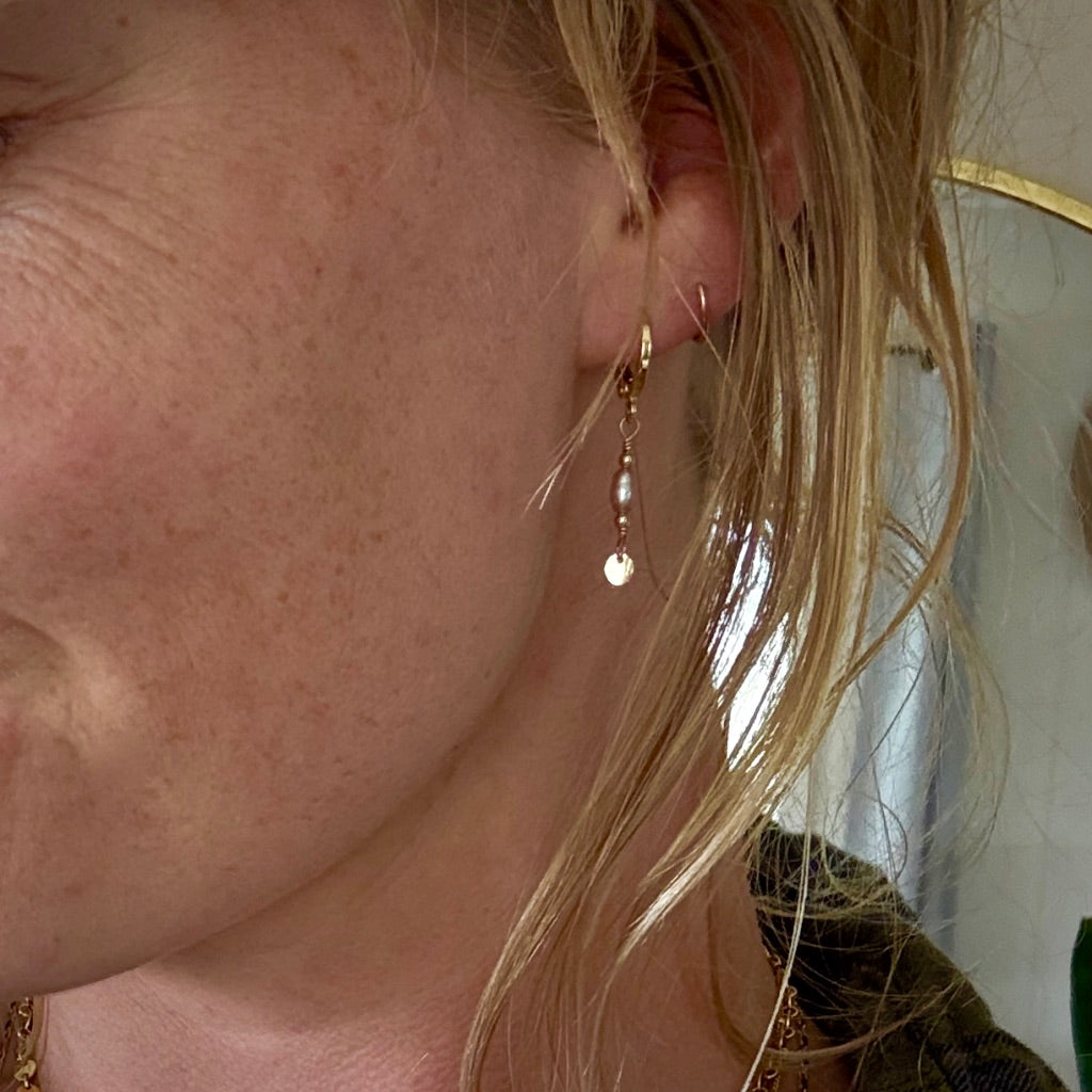 Tiny hand beaded pink freshwater pearls and gold filled beads, featuring a tiny flashy gold filled disc at the end.