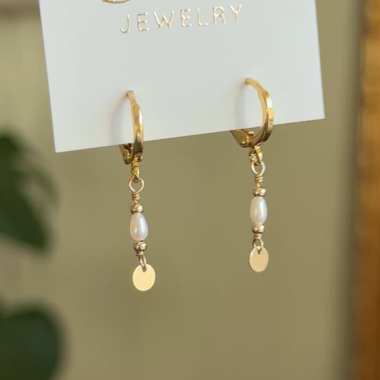 Gold-filled huggie hoops featuring hand-beaded tiny white freshwater pearls, sacked with gold filled beads, and a tiny light catching gold-filled disc